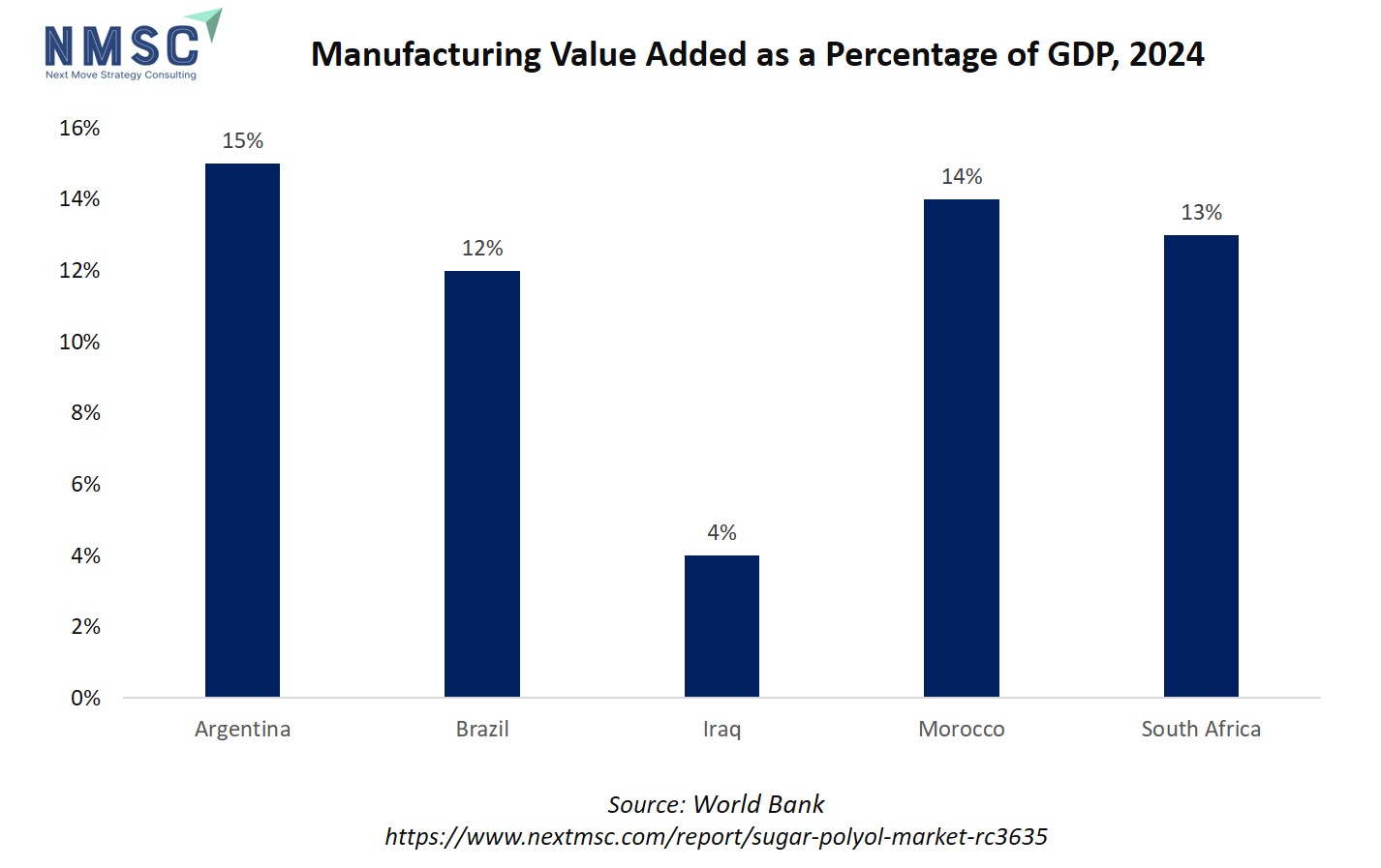 The chart depicts manufacturing value added as a percentage of GDP for five countries in 2024. This information signals the relative strength of each country's manufacturing sector, which directly impacts the sugar polyol market demand by determining domestic production capacities and operational efficiencies. Countries with higher manufacturing value added are better positioned to support local production of sugar polyol, lower operational costs, and quickly respond to growing demand for sugar alternatives, making these markets more competitive and resilient in the expanding global polyol industry.