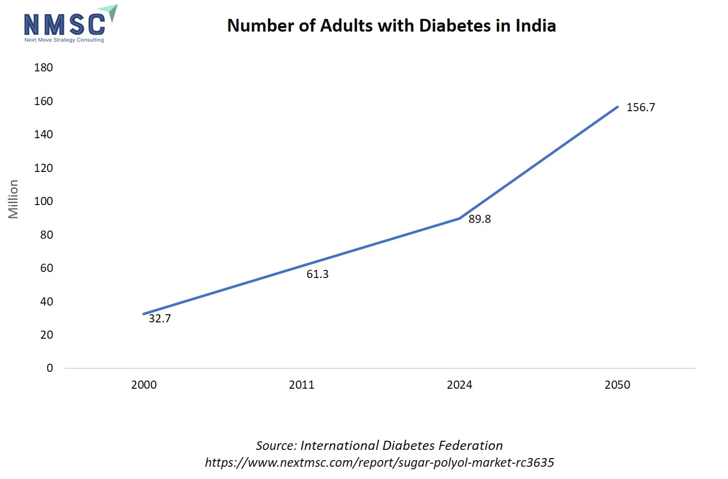 The chart shows a dramatic rise in the number of adults with diabetes in India, increasing from 32.7 million in 2000 to a projected 156.7 million by 2050. This steep upward trend indicates a growing population seeking alternatives to traditional sugar, directly boosting demand for sugar polyol since these sweeteners are recognized as safe for diabetics and can help manage blood sugar levels. As a result, the spike in diabetes prevalence fuels robust market growth for sugar polyol in India, encouraging food and beverage manufacturers to develop more diabetic-friendly products and making polyols a preferred choice for health-conscious consumers.