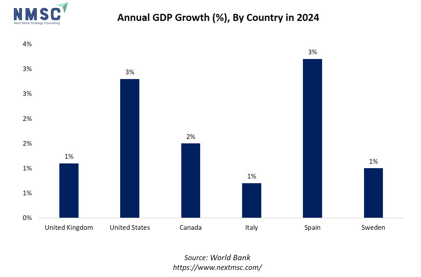 The bar chart illustrates the annual GDP growth rate (%) in 2024 across selected countries. Spain recorded the highest GDP growth at 3.20%, reflecting strong economic recovery and industrial expansion. The United States followed with 2.80%, supported by robust manufacturing, energy production, and logistics activities. Canada registered a moderate growth rate of 1.50%, while the United Kingdom and Sweden posted similar growth levels at 1.10% and 1.00%, respectively. Italy showed the slowest growth among the listed countries, at 0.70%, indicating a more stable but restrained industrial environment.