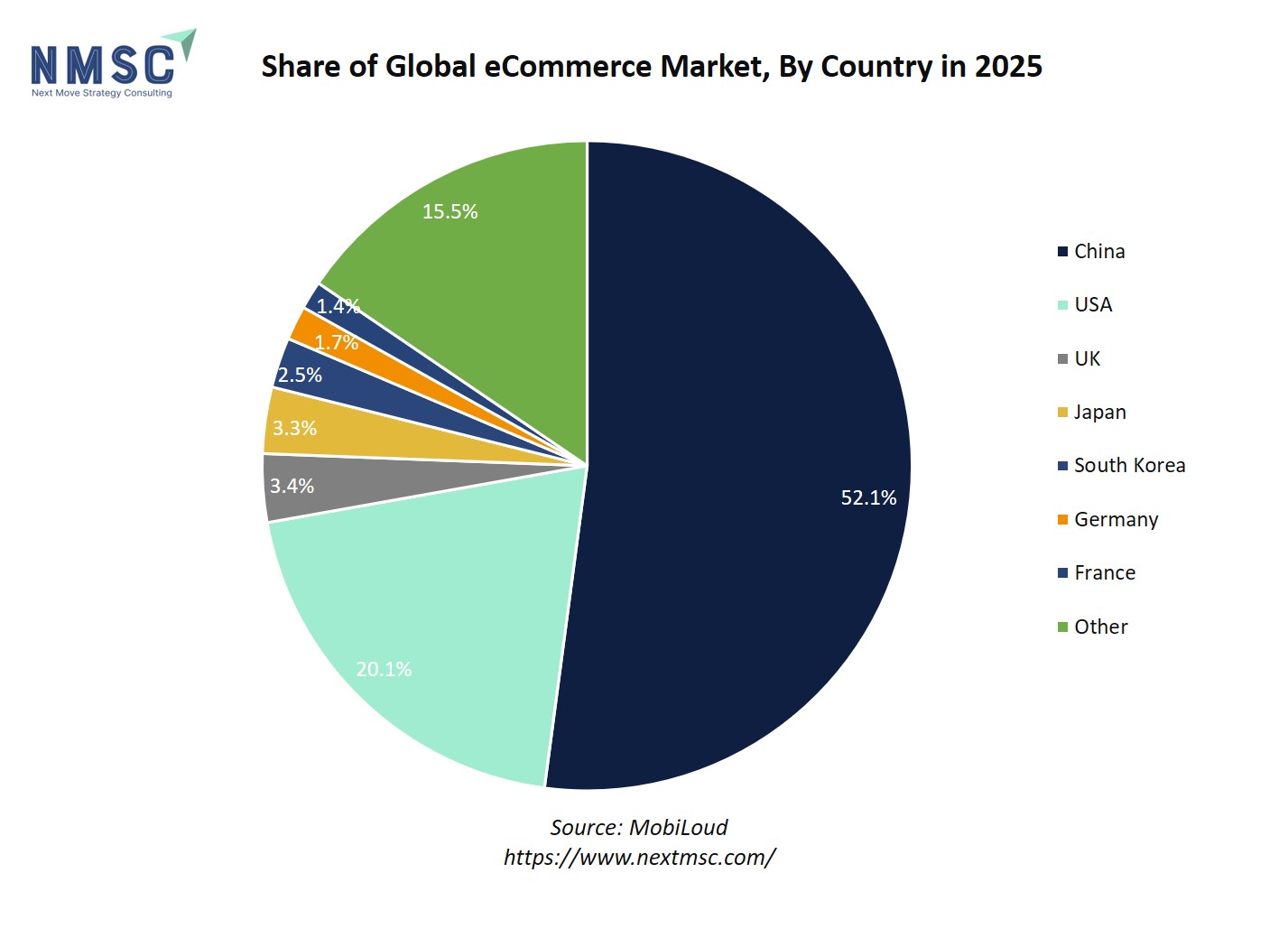 The pie chart depicts the global e-commerce market share by country in 2025. China dominates the market with a 52.1% share, accounting for over half of global e-commerce activity. The USA follows with 20.1%, while the UK and Japan contribute 3.4% and 3.3%, respectively. South Korea, Germany, and France hold smaller shares of 2.5%, 1.7%, and 1.4%, respectively. The remaining countries collectively represent 15.5% under the “Other” category.